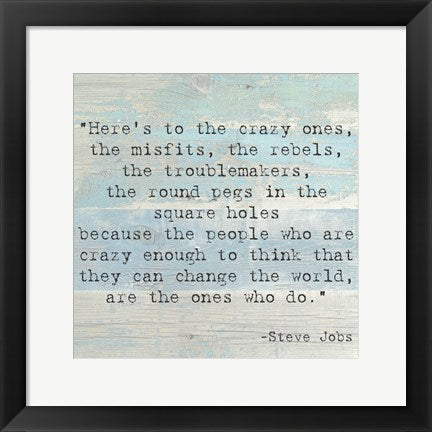 This wall art Here's to the Crazy Ones, Steve Jobs Quote print is created by top quality printers for your home wall art with vivid art prints and canvas colors. Quality Modern Memory Design art print are perfect gallery wall made in our New Jersey frame shop for you. Choice art print, stretched canvas or framed art for your wall decor