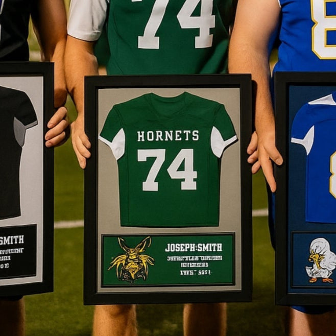 Celebrate your high school football player's achievements with a custom jersey frame print from Modern Memory Design. This unique senior gift idea is perfect for senior night, offering a fully customized jersey design print that reflects your school's theme. Each print is beautifully placed in a 20x24 black wood frame, ready to be displayed on your wall post-graduation.