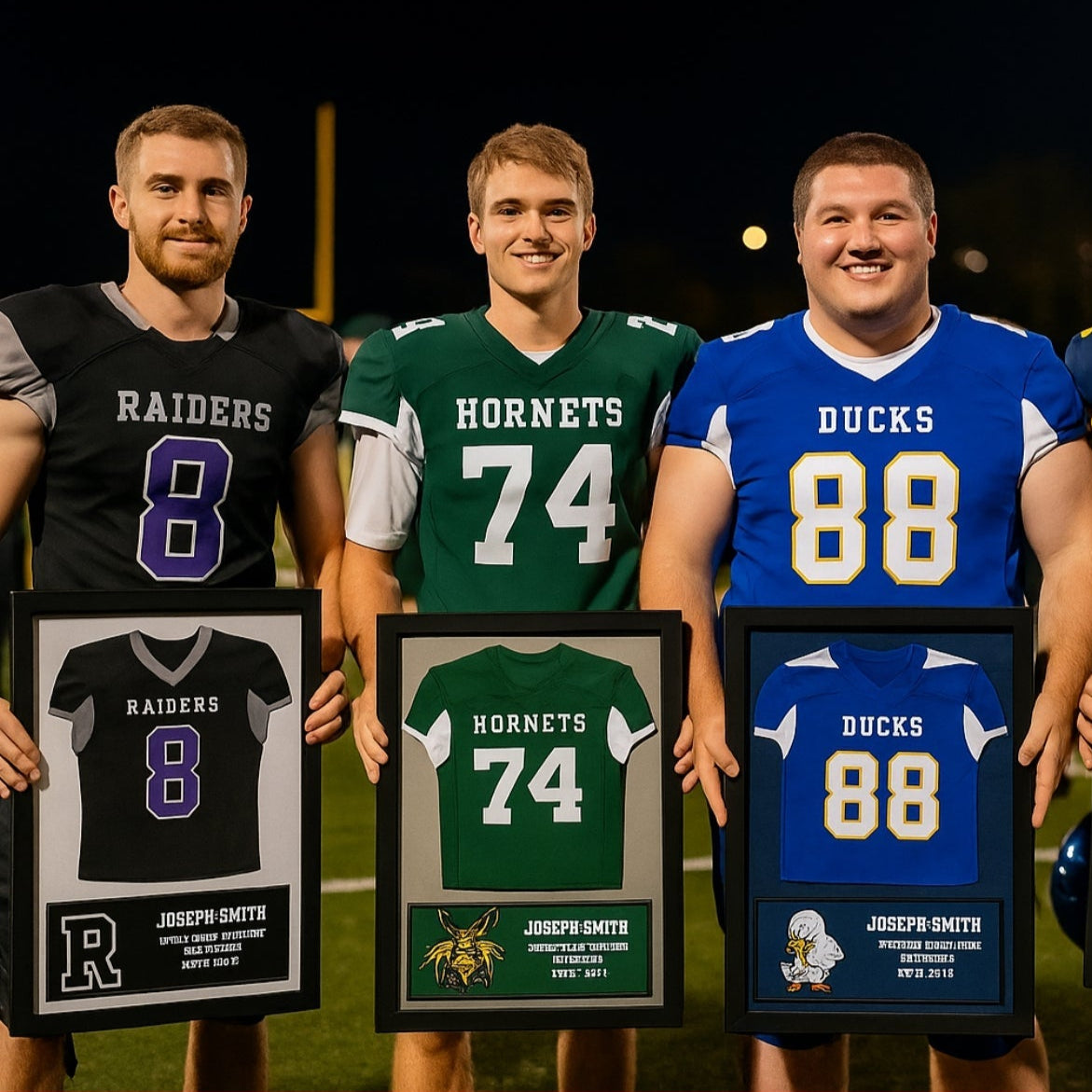 Celebrate your high school football player's achievements with a custom jersey frame print from Modern Memory Design. This unique senior gift idea is perfect for senior night, offering a fully customized jersey design print that reflects your school's theme. Each print is beautifully placed in a 20x24 black wood frame, ready to be displayed on your wall post-graduation.