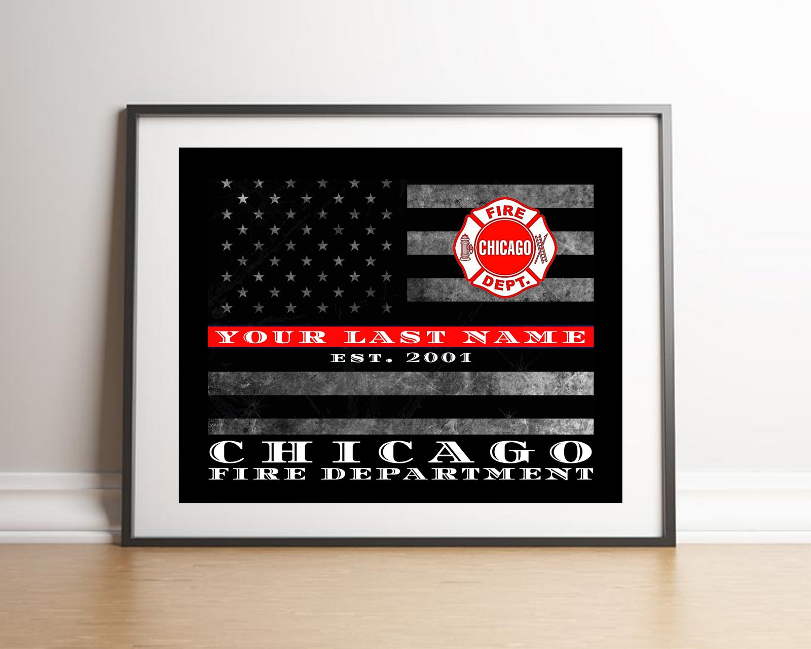Chicago Fire Department Thin Red Line Flag picture frame made for Chicago Fire Department firefighters.This Personalized fireman Thin red Line Flag Artwork will last a lifetime in your home. Have your wall space define you and your family. Lets create personalized home decor. This framed art will be an eye-catching display in your home for your friends and family to see. Home wall art decor is to showcase your own personal art taste, framed wall art offers a way to incorporate yourself into your home decor.