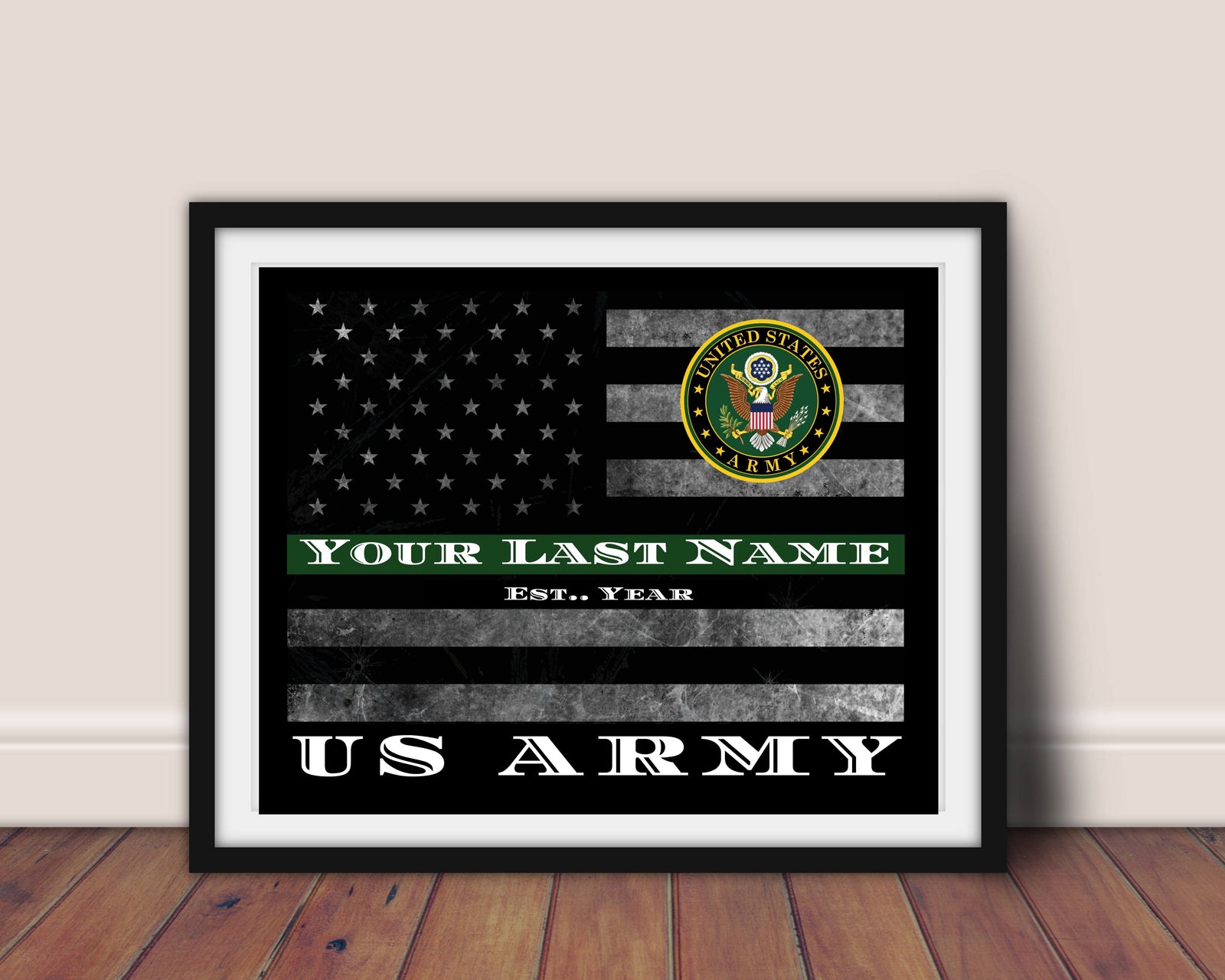 This handmade picture-framed US Army Custom Thin Green Line Flag adds a personalized touch to your wall decor. It features two officers, their last name, the year established, and the city and state. Crafted for durability, it honors US Army Marines, Navy, and Coast Guard officers. Hang it in your home to show your respect in style.