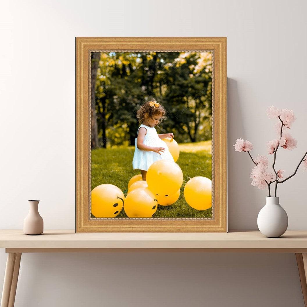 • Sleek, Contemporary Design: Featuring a traditional ornate scoop profile, this custom frame is adorned with a luxurious, rich gold finish, adding a touch of elegance to your decor.