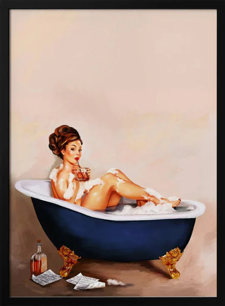 Framed Art Pinup Girl Enjoying a Drink in the Bathtub - The Whiskey Ginger 24x36 for Home or Office