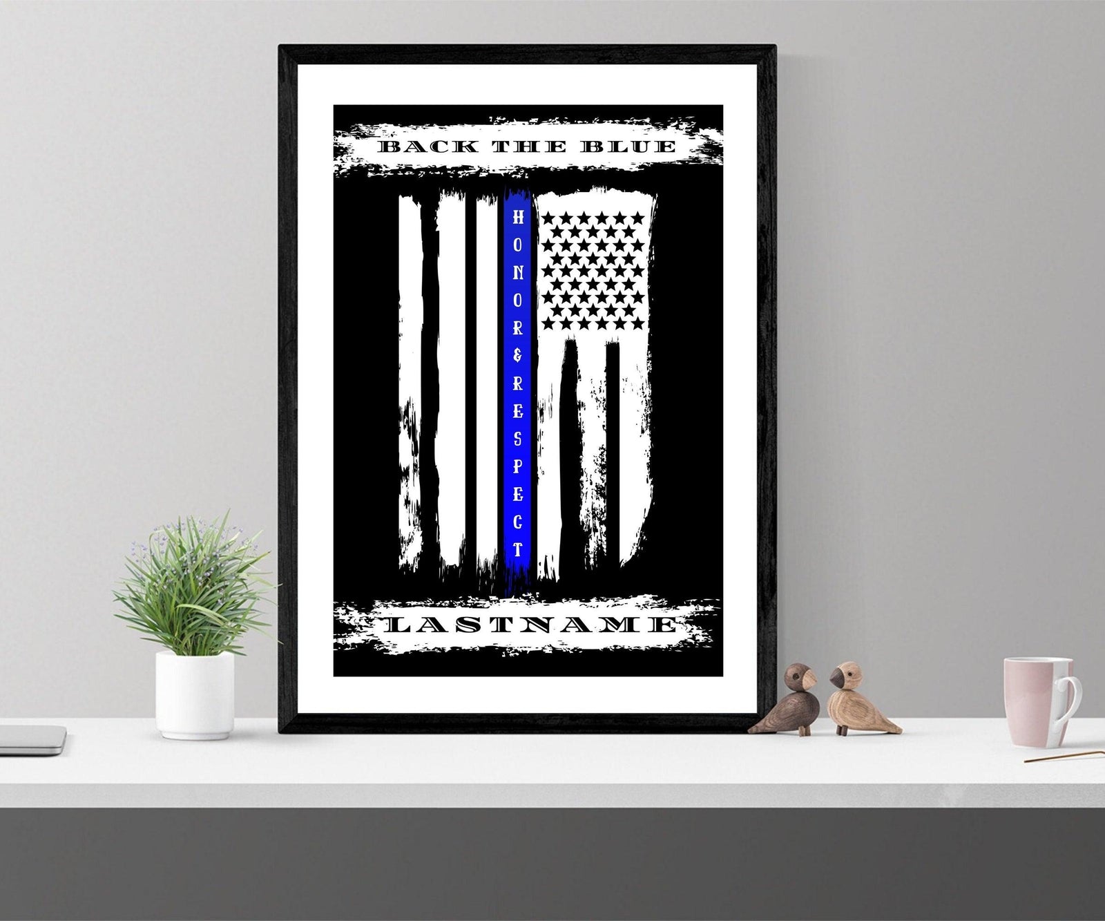Show your support for law enforcement with our custom Thin Blue Line Police Officer wall art. This unique piece serves as a heartfelt decoration for any police officer's home or office. Crafted with care, it features a striking design that honors the bravery and dedication of police officers.