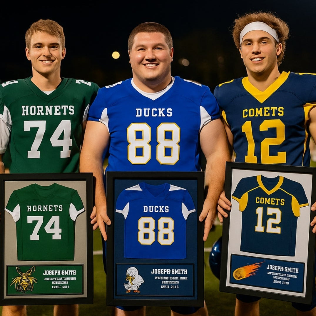Celebrate your high school football player's achievements with a custom jersey frame print from Modern Memory Design. This unique senior gift idea is perfect for senior night, offering a fully customized jersey design print that reflects your school's theme. Each print is beautifully placed in a 20x24 black wood frame, ready to be displayed on your wall post-graduation.