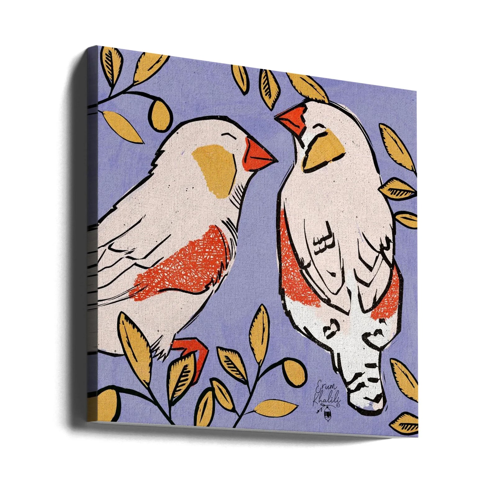 Elevate your home with Finch Love Birds Purple Background 2.png by Erum Khalili 24x24 Square Canvas Print Art from shopmodernmemory.com, where elegance meets contemporary design. Choose from a variety of designs and sizes to match your decor, making it a versatile addition to living rooms, bedrooms, or offices.