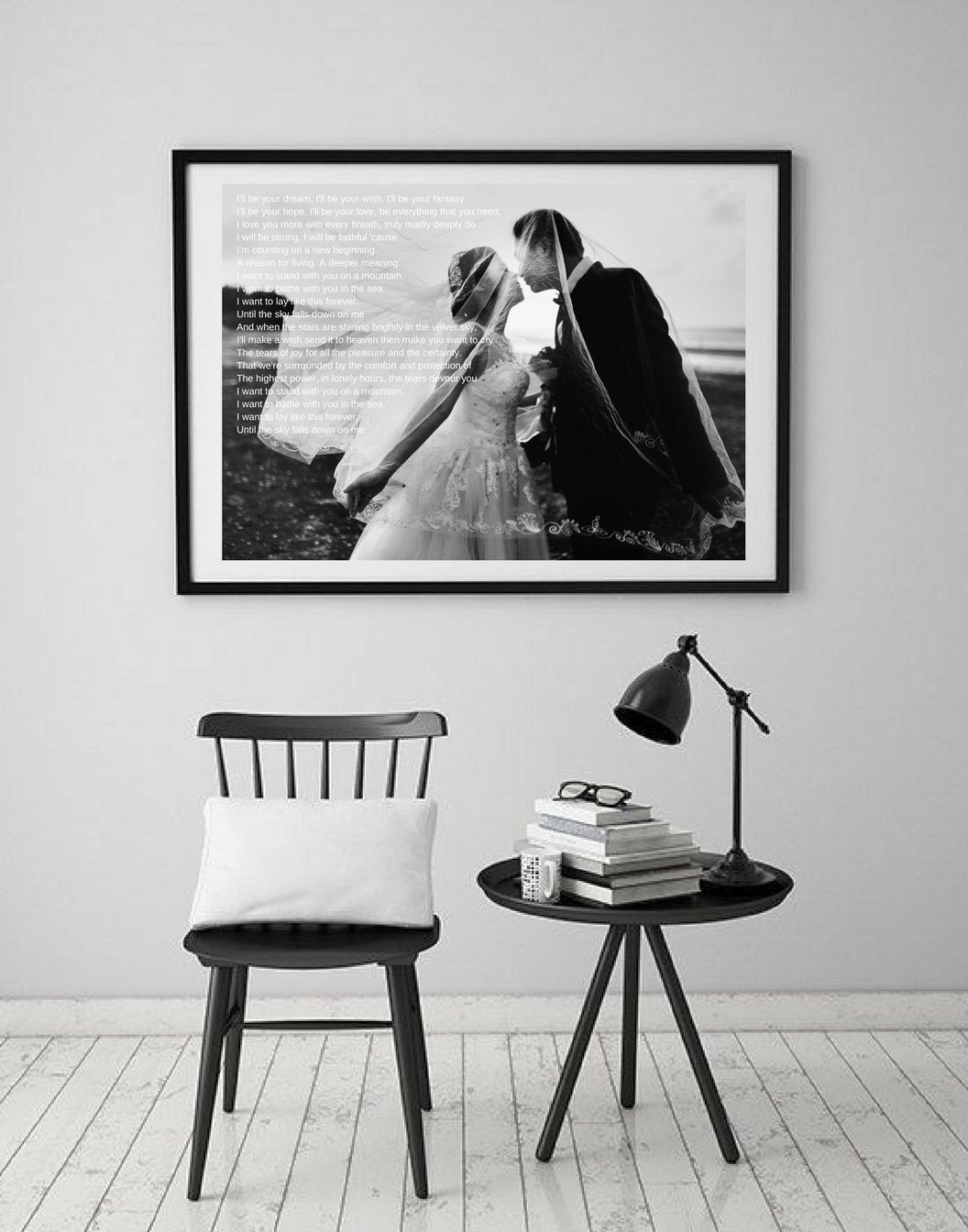 Imagine walking into your living room, your eyes catching a beautiful piece of art on the wall—a thoughtful representation of your wedding first dance song lyrics, elegantly displayed and infused with the love story that you and your partner share. As you sip your morning coffee or unwind in the evening, this artwork transports you back to that unforgettable moment, bringing warmth, gratitude, and a sense of intimacy into your everyday life.